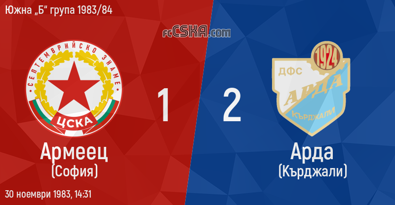 Армеец Сф загуби от Арда (Кърджали) с резултат 1:2 във футболна среща от 13-и кръг на Южна „Б“ група 1983/84 играна на 30 ноември 1983 г. в 14:31 ч.
