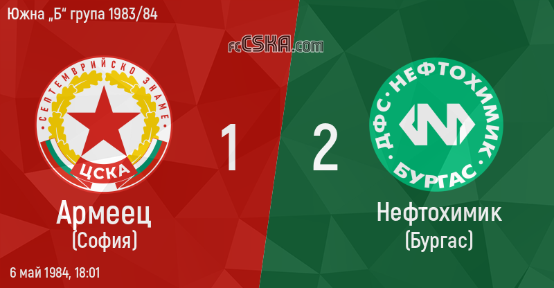 Армеец Сф загуби от Нефтохимик (Бургас) с резултат 1:2 във футболна среща от 28-и кръг на Южна „Б“ група 1983/84 играна на 6 май 1984 г. в 18:01 ч.