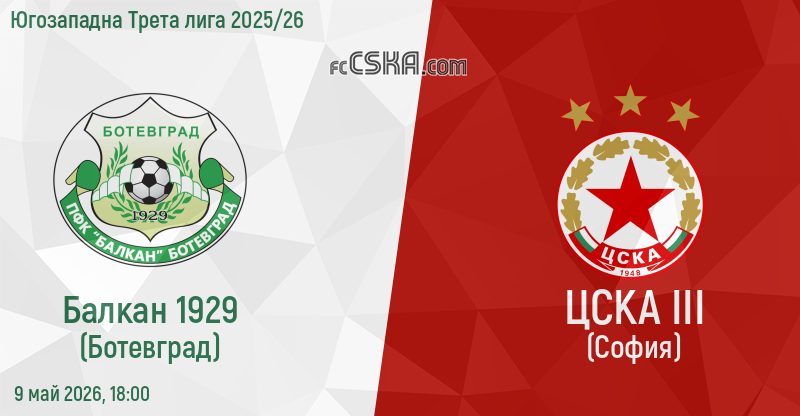 ЦСКА III ще играе с/със Балкан Бот. във футболна среща от 31-ви кръг на Югозападна Трета лига 2025/26 на 9 май 2026 г. в 18:00 ч. на стадион „Христо Ботев“ в/във Ботевград.