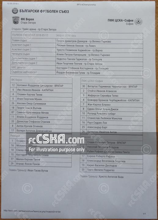 ЦСКА победи Верея (Стара Загора) с резултат 0:2 във футболна среща от 34-ти кръг на Първа професионална лига 2017/18 - първа шестица играна на 12 май 2018 г. в 20:15 ч. на стадион „Трейс арена“ в/във Стара Загора. Голмайстори за Армейците са Александър Барт (64′) и Роланд Алберг (72′).
