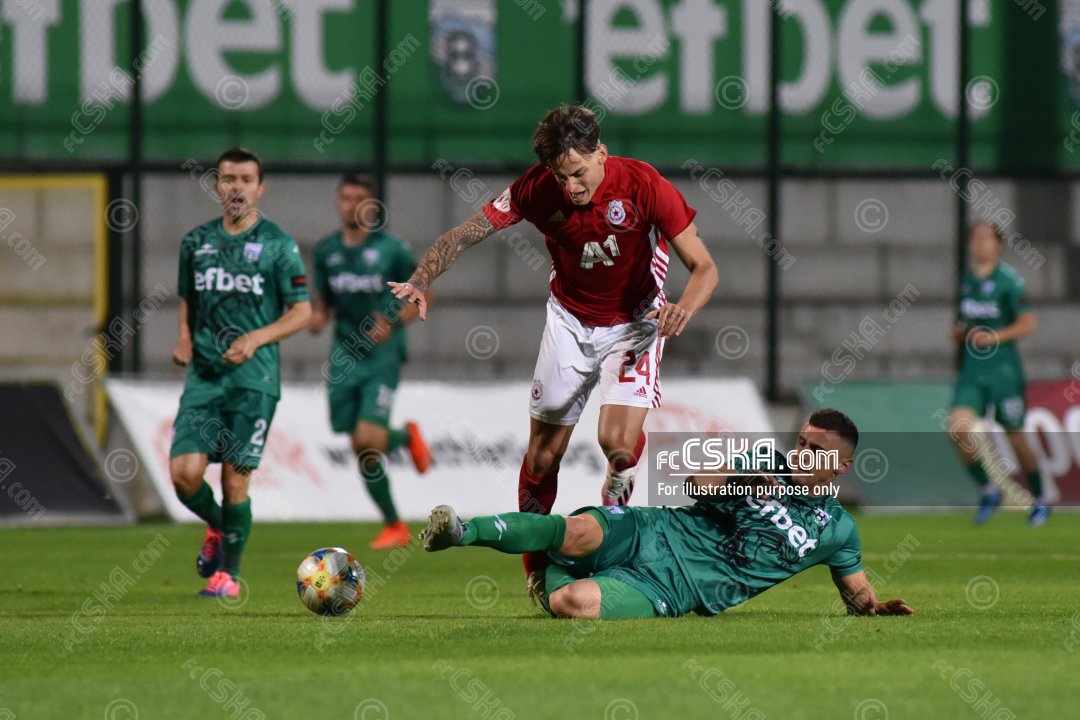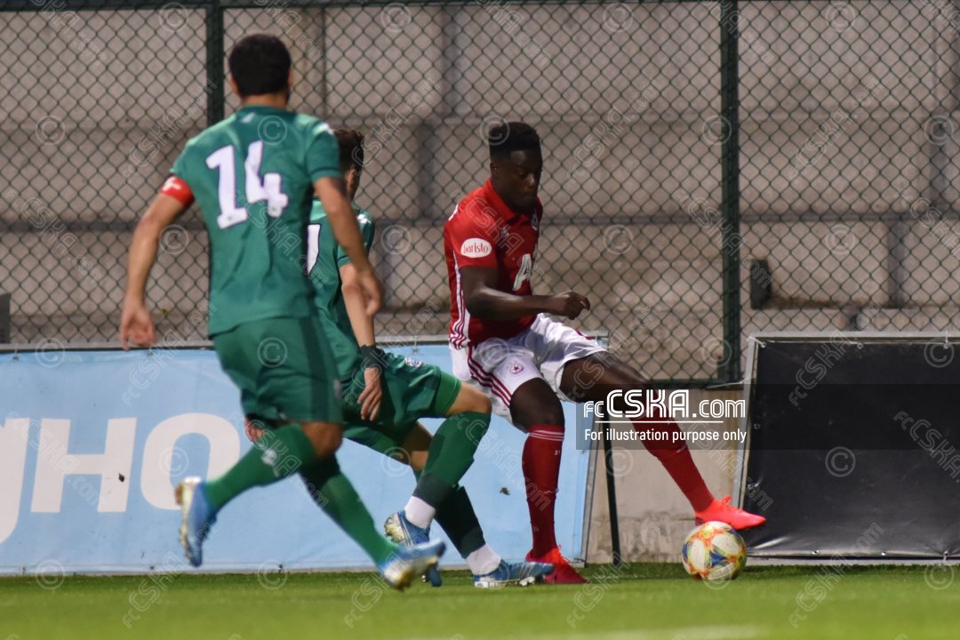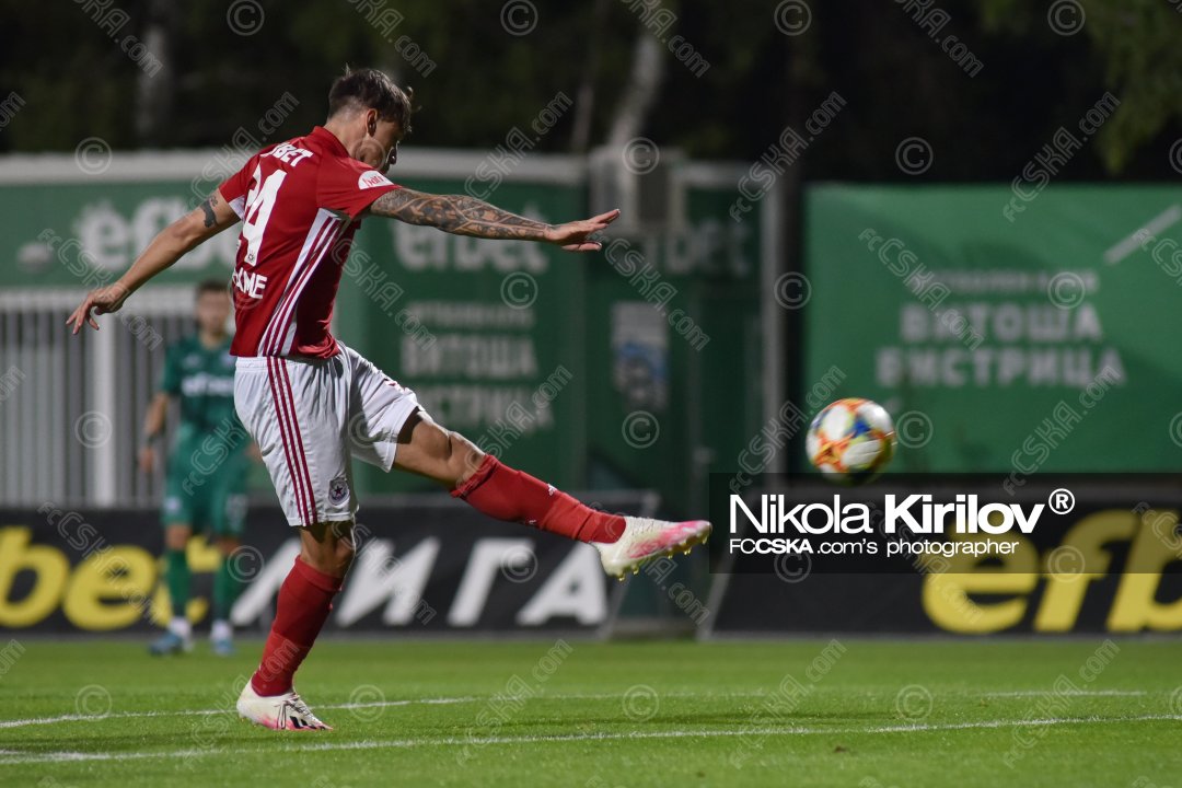 В 23-та минута чудесен пробив на Мазику след пас на Джеси, Динев хваща с ръце Мазику - дузпа за червените и жълт картон за Кръстев за протести.