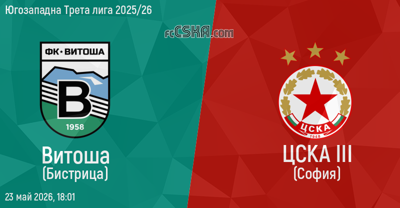 ЦСКА III ще играе с/със Витоша Бстр във футболна среща от 33-ти кръг на Югозападна Трета лига 2025/26 на 23 май 2026 г. в 18:01 ч. на стадион „Летище“ в/във София.