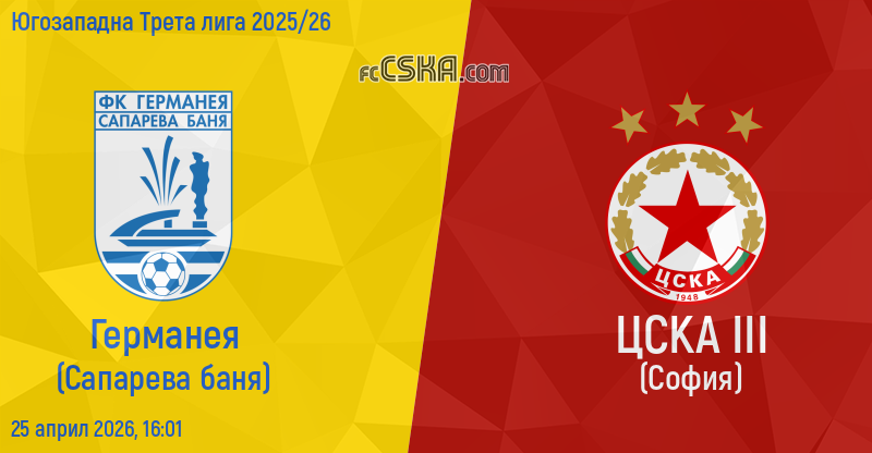 ЦСКА III ще играе с/със Германея във футболна среща от 29-и кръг на Югозападна Трета лига 2025/26 на 25 април 2026 г. в 16:01 ч. на стадион „Сапарева баня“ в/във Сапарева баня.