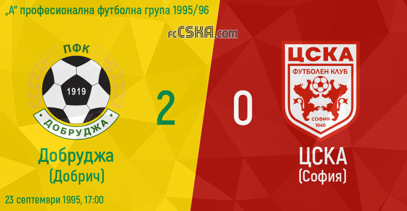 ЦСКА загуби от Добруджа (Добрич) с резултат 2:0 във футболна среща от 7-и кръг на „А“ професионална футболна група 1995/96 играна на 23 септември 1995 г. в 17:00 ч. на стадион „Дружба“ в/във Добрич.