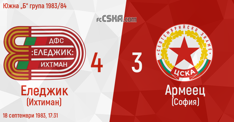 Армеец Сф загуби от Еледжик (Ихтиман) с резултат 4:3 във футболна среща от 5-и кръг на Южна „Б“ група 1983/84 играна на 18 септември 1983 г. в 17:31 ч.