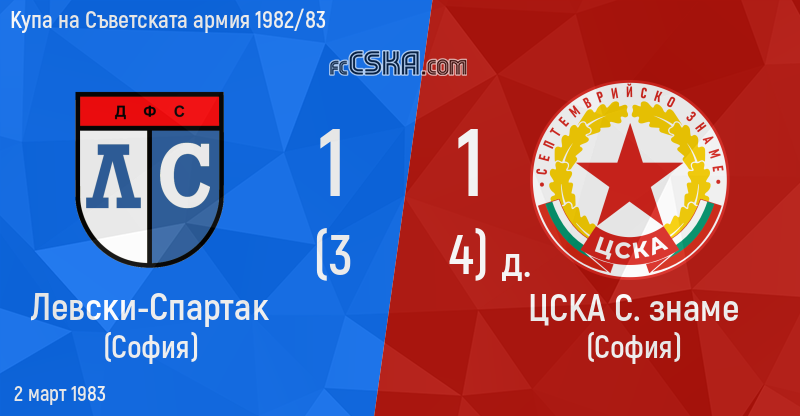 ЦСКА „Септемврийско знаме“ завърши наравно с Левски-Спартак (София) с резултат 1:1 във футболна среща от Четвъртфинал на Купа на Съветската армия 1982/83 играна на 2 март 1983 г. на стадион „Васил Левски“ в/във София. Голмайстори за Армейците са Радослав Здравков (77′ и 121′ от дузпа), Пламен Марков (121′ от дузпа), Георги Илиев — Майкъла (121′ от дузпа) и Георги Велинов (121′ от дузпа).