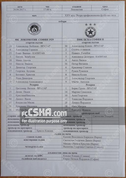 ЦСКА II завърши наравно с Локомотив 1929 (София) с резултат 2:2 във футболна среща от 25-и кръг на Втора професионална лига 2016/17 играна на 24 април 2017 г. в 17:00 ч. на стадион „Локомотив“ в/във София.