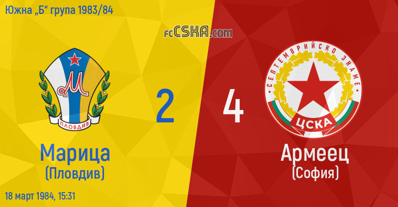 Армеец Сф победи Марица (Пловдив) с резултат 2:4 във футболна среща от 21-ви кръг на Южна „Б“ група 1983/84 играна на 18 март 1984 г. в 15:31 ч.