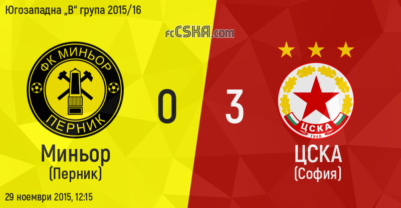 ЦСКА завърши без загубена точка есенния полусезон в Югозападна „В“ група.В двубой от последния, 16-и есенен кръг на шампионата „армейците“ победиха като гости Миньор (Перник) с 3:0.Николай Цветков в 26-ата минута, Преслав Йорданов в 49-ата и Момчил Цветанов в 69-ата минута вкараха головете за успеха на ЦСКА.От 50-ата минута Миньор игра с десет души след втори жълт и червен картон за Виктор Софрониев.
