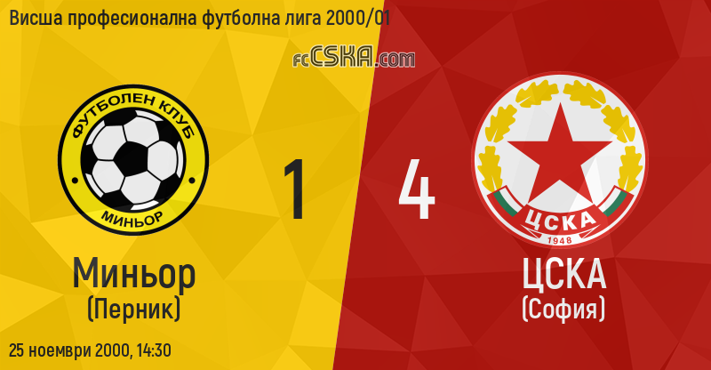 ЦСКА​ победи Миньор (Перник) с резултат 1:4 във футболна среща от 13-и кръг на Висша професионална футболна лига 2000/01 играна на 25 ноември 2000 г. в 14:30 ч. на стадион „Миньор“ в/във Перник. Голмайстори за Армейците са Асен Букарев (12′), Методи Деянов (46′), Христо Янев (73′) и Костадин Видолов (90′).