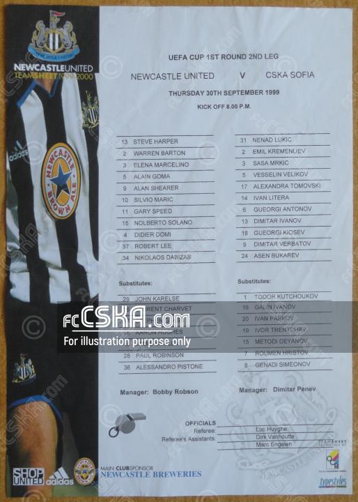 ЦСКА завърши наравно с Нюкасъл Юнайтед с резултат 2:2 във футболна среща от Първи кръг — реванш на Купа на УЕФА 1999/00 играна на 30 септември 1999 г. в 22:00 ч. на стадион „Сейнт Джеймсис Парк“ в/във Нюкасъл. Голмайстори за Армейците са Иван Литера (30′) и Генади Симеонов (94′).