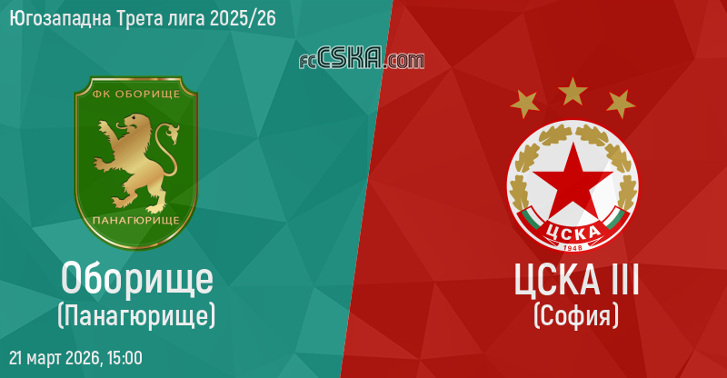 ЦСКА III ще играе с/със Оборище във футболна среща от 24-ти кръг на Югозападна Трета лига 2025/26 на 21 март 2026 г. в 15:00 ч. на стадион „Орчо Войвода“ в/във Панагюрище.