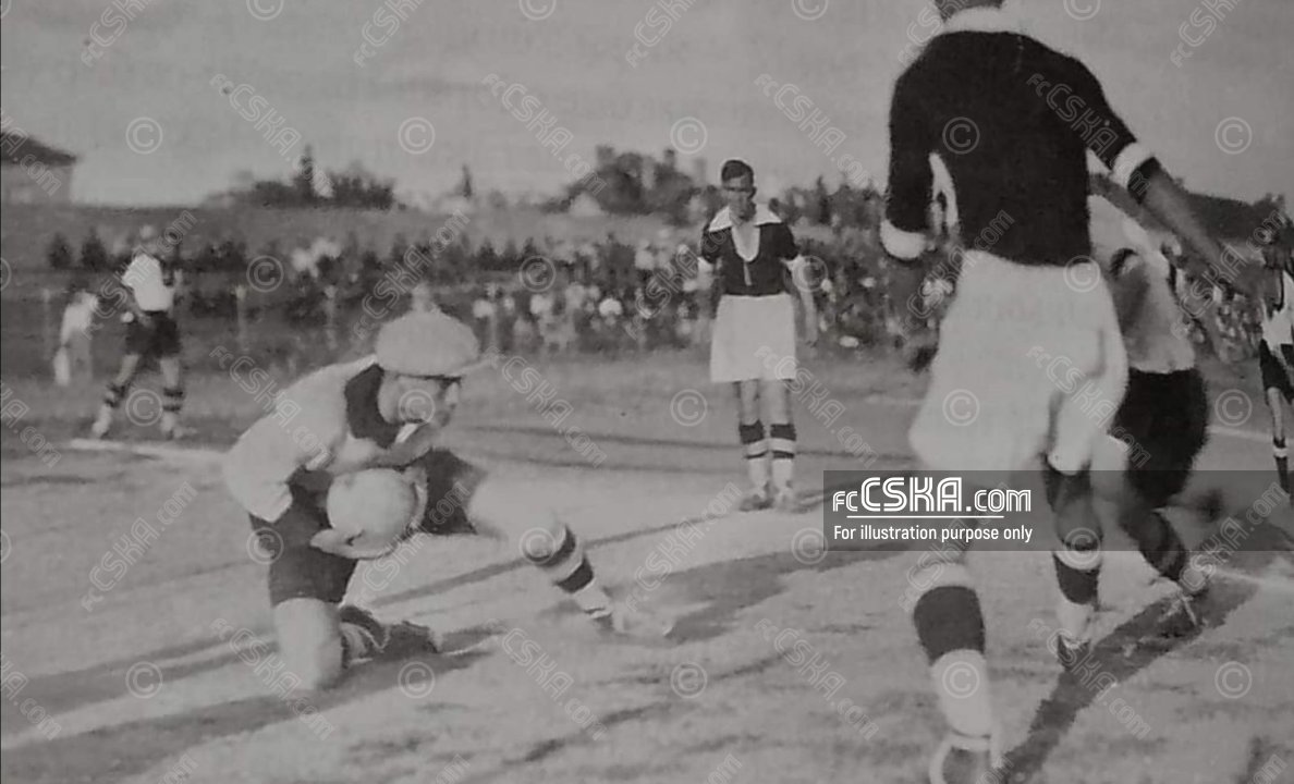 5 м. по късно десното крило се бори с Генков за топката в наполе. Генков, който играе халф пада и реферът пресилено