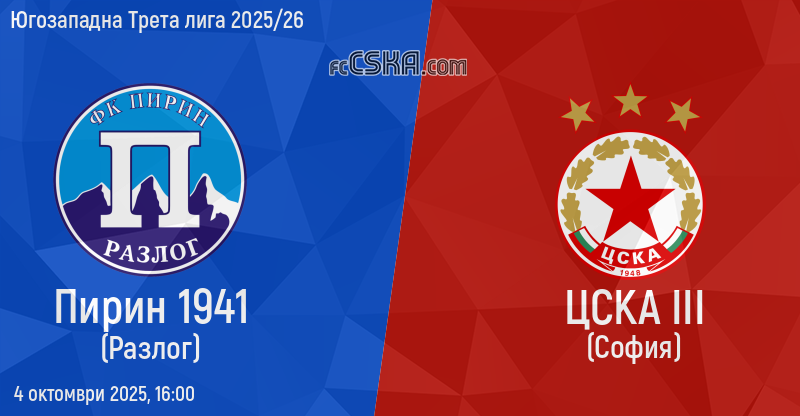 ЦСКА III ще играе с/със Пирин Рзл във футболна среща от 11-и кръг на Югозападна Трета лига 2025/26 на 4 октомври 2025 г. в 16:00 ч. на стадион „Септември“ в/във Разлог.