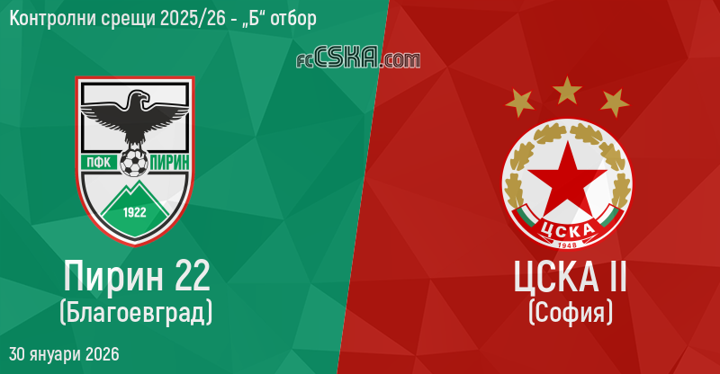 ЦСКА II ще играе с/със Пирин във футболна среща от Контролни срещи 2025/26 - „Б“ отбор на 30 януари 2026 г. на стадион „Христо Ботев“ в/във Благоевград.