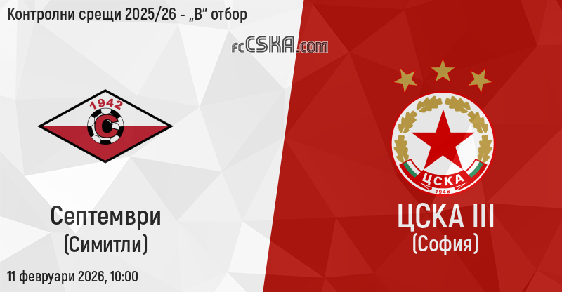 ЦСКА III ще играе с/със Септември Сим във футболна среща от Контролни срещи 2025/26 - „В“ отбор на 11 февруари 2026 г. в 10:00 ч.