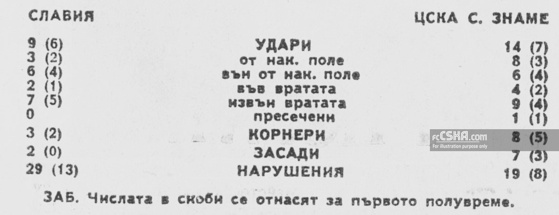 През втората част „Славия“ бе принудена да мине в дълбоко ешелонизирана, глуха защита. Наистина имаше състезатели, които в невъобразимите бъркотии пред вратата изпъкнаха с мъжество и пожертвователност. Това бе преди всичко Гугалов, пресякъл и уловил, отразил хладнокръвно много опасни топки. След някои колебания в първенството и Дерменджиев даде доказателства за бойкост и сигурност. Не се щадяха и съиграчите им при тоталната отбрана. Но при повече само обладание и находчивост на армейските нападатели крепостта не само щеше да бъде разклатена, но можеше и да рухне, защото малко оставаше на Джевизов, Горанов, Мирчев, особено на Стефанов да я пробият с по-точна стрелба. Така съпротивителната сила на „Славия“ издържа.