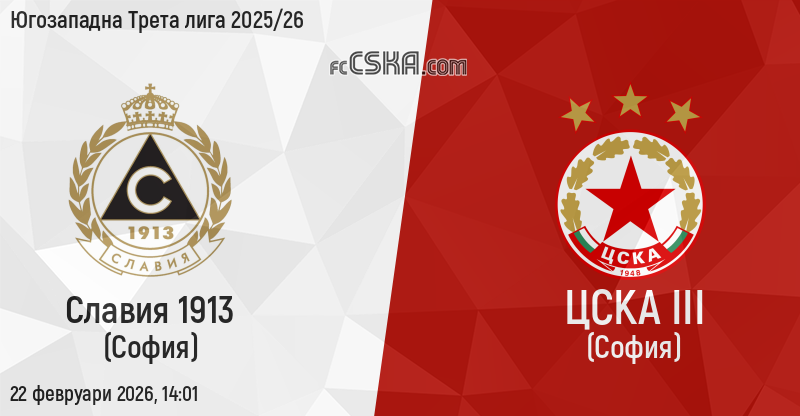ЦСКА III ще играе с/със Славия II във футболна среща от 20-и кръг на Югозападна Трета лига 2025/26 на 22 февруари 2026 г. в 14:01 ч. на стадион „Александър Шаламанов“ в/във София.