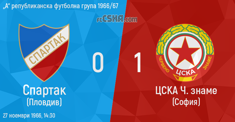 ПЛОВДИВ, 27 ноември. На стадион „Девети септември“ днес се разви една динамична и оспорвана борба между двата отбора от „А“ републиканска група по футбол – шампиона на страната ЦСКА „Ч. знаме“ и местния „Спартак“. Въпреки че състезателите от пловдивския отбор установиха известен териториален превес, те се оказаха по-слаби стрелци, погрешно сбиваха играта в центъра, разчитайки предимно на Дишков, който бе добре пазен.