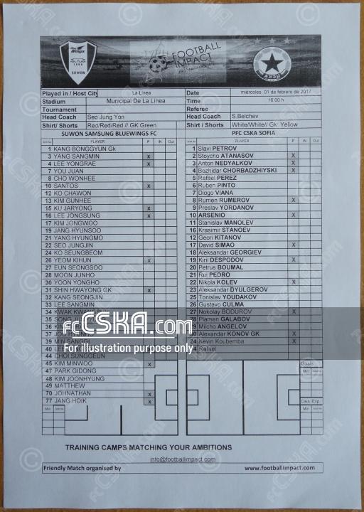 ЦСКА загуби с 0:4 контролата с корейския Сувон. Армейците започнаха в експериментален състав, като старши треньорът Стамен Белчев даде шанс за изява на повече състезатели, които имаха по-малко игрови минути. Дебют за ЦСКА направи новото попълнение Кевин Кубемба. След равностойно начало, корейците откриха резултата в деветата минута, когато Джонатан от малък ъгъл не остави шансове на Конов. Най-сериозната опасност пред вратата на Сувон дойде в 16 минута, когато Кирил Десподов изпълни пряк свободен удар от границата на наказателното поле. Неговият изстрел срещна стената, но останаха сериозни съмнения, че защитник на Сувон игра с ръка. В 33-тата минута Александър Георгиев замени Арсенио Нунеш, а до края на полувремето нямаше други сериозни опасности.