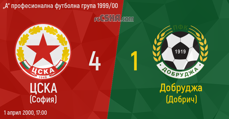 ЦСКА победи Добруджа (Добрич) с резултат 4:1 във футболна среща от 21-ви кръг на „А“ професионална футболна група 1999/00 играна на 1 април 2000 г. в 17:00 ч. на стадион „Българска армия“ в/във София. Голмайстори за Армейците са Красимир Чомаков (25′), Димитър Бербатов (44′ и 50′) и Димитър Иванов (64′).