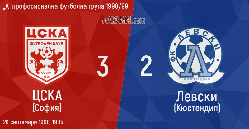 ЦСКА победи Левски (Кюстендил) с резултат 3:2 във футболна среща от 7-и кръг на „А“ професионална футболна група 1998/99 играна на 26 септември 1998 г. в 19:15 ч. на стадион „Българска армия“ в/във София. Голмайстори за Армейците са Валентин Станчев (6′), Георги Йорданов (15′) и Румен Христов (72′).