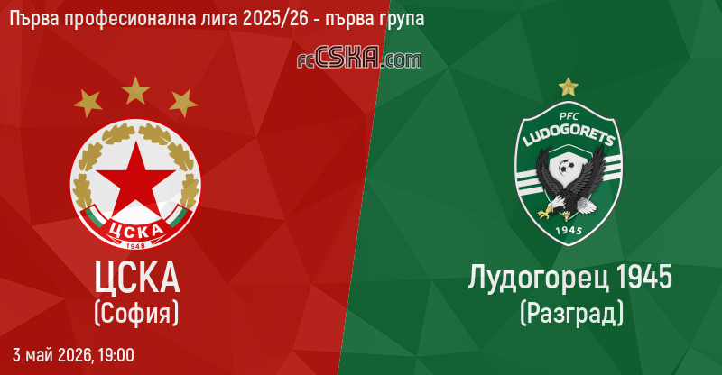 ЦСКА ще играе с/със Лудогорец във футболна среща от 32-ри кръг на Първа професионална лига 2025/26 - първа група на 3 май 2026 г. в 19:00 ч. на стадион „Васил Левски“ в/във София. Мачът ще бъде предаван на живо по „Диема спорт”.