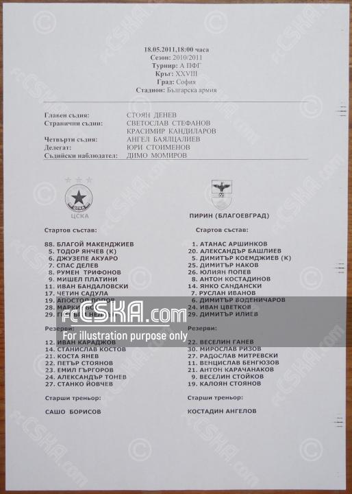 ЦСКА завърши 2:2 с Пирин, като по този начин за първи път загуби точки на свой терен през календарната 2011 година. До момента през тази пролет „червените” бяха загубили единствено гостуването си на Черно море във Варна, а също така постигнаха хикс в Ловеч на шампиона Литекс.