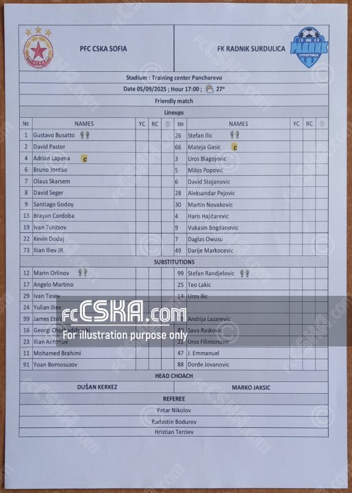 ЦСКА победи Радник (Сурдулица) с резултат 2:0 във футболна среща от Контролни срещи 2025/26 играна на 5 септември 2025 г. в 17:00 ч. на стадион „сп. компл. „ЦСКА““ в/във Панчарево. Голмайстори за Армейците са Пастор (26′) и Леандро Годой (39′).