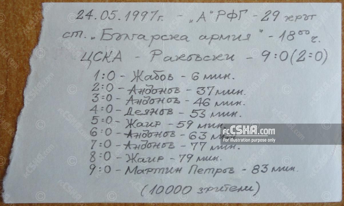 ЦСКА победи Раковски (Русе) с резултат 9:0 във футболна среща от 29-и кръг на „А“ професионална футболна група 1996/97 играна на 24 май 1997 г. на стадион „Българска армия“ в/във София. Голмайстори за Армейците са Петър Жабов (6′), Ивайло Андонов (37′, 46′, 63′ и 77′), Методи Деянов (54′), Жаир (58′ и 79′) и Мартин Петров (82′).