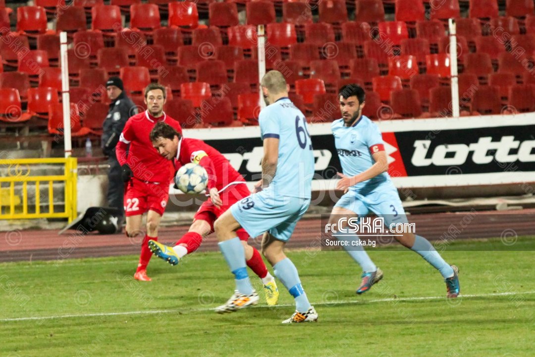 Йордан Йорданов имаше страхотна възможност да улесни двубоя за ЦСКА в 11-ата минута. Той обаче стреля неточно с глава от точката за изпълнение на дузпа след хубав пробив и центриране на Момчил Цветанов.
