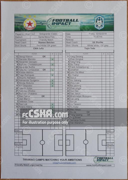 ЦСКА завърши наравно с Тиендзин ТЕДА с резултат 1:1 във футболна среща от Контролни срещи 2017/18 играна на 2 февруари 2018 г. в 17:00 ч. на стадион „Марбея футбол център“ в/във Марбея. Голмайстор за Армейците е Фернандо Каранга (7′).