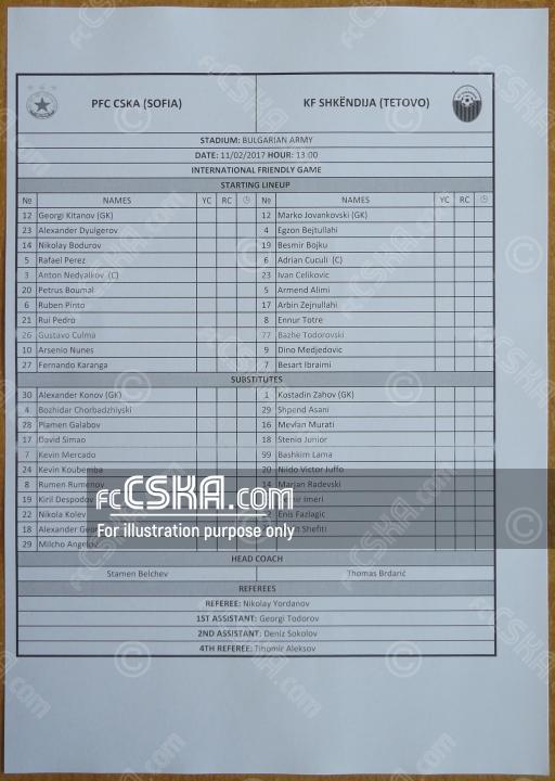 ЦСКА разгроми македонския Шкендия (Тетово) с 8:1 в представянето на отбора за пролетния полусезон пред около 3000 зрители на стадион „Българска армия“. Още в петата минута състезател на гостите беше изгонен с директен червен картон за изключително грубо нарушение срещу Каранга. По договорка между двата тима обаче той бе заменен с друг футболист. Гостите откриха резултата в 16-тата минута след отлична атака на Бесарт Ибраими, който се разписа след премерен удар. Равенството бе възстановено в 25-тата минута, когато Рафаел Перес се оказа най-съобразителен при разбъркване. Само 2 минути по-късно Александър Дюлгеров изведе армейците напред в резултата. В 33-тата минута Фернандо Каранга откри головата си сметка с червения екип след асистенция на Густаво Кулма. Голеадата бе продължена от Руи Педро в 37-та минута, а само 60 секунди след това и Рубен Пинто записа името си след голмайсторите. Преди почивката Педро се разписа за втори път с изключително красив изстрел почти от аутлинията.