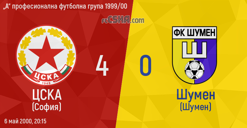 ЦСКА победи Шумен (Шумен) с резултат 4:0 във футболна среща от 25-и кръг на „А“ професионална футболна група 1999/00 играна на 6 май 2000 г. в 20:15 ч. на стадион „Българска армия“ в/във София. Голмайстори за Армейците са Владимир Манчев (3′), Димитър Бербатов (30′ от дузпа и 86′ от дузпа) и Станислав Ангелов (45′).