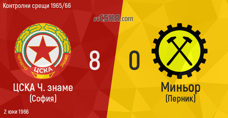 ЦСКА „Червено знаме“ победи Миньор (Перник) с резултат 8:0 във футболна среща от Контролни срещи 1965/66 играна на 2 юни 1966 г.