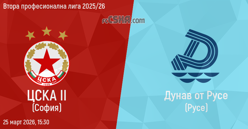 ЦСКА II ще играе с/със Дунав във футболна среща от 21-ви кръг на Втора професионална лига 2025/26 на 25 март 2026 г. в 15:30 ч. на стадион „Драгалевци“ в/във София.