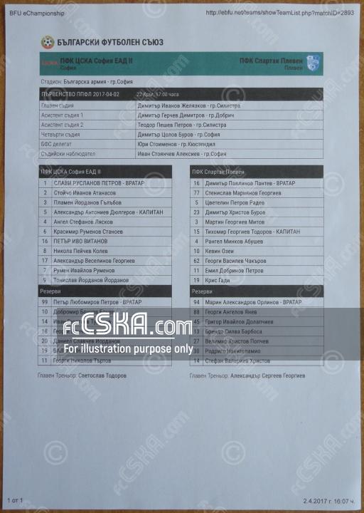 ЦСКА II завърши наравно с Спартак (Плевен) с резултат 1:1 във футболна среща от 22-ри кръг на Втора професионална лига 2016/17 играна на 2 април 2017 г. в 17:00 ч. на стадион „Българска армия“ в/във София.