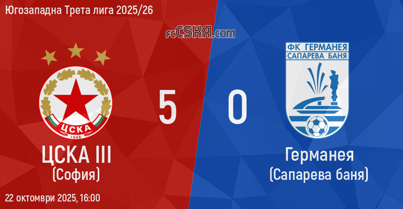 ЦСКА III​ победи Германея (Сапарева баня) с резултат 5:0 във футболна среща от 12-и кръг на Югозападна Трета лига 2025/26 играна на 22 октомври 2025 г. в 16:00 ч. на стадион „Бенковски“ в/във Костенец.