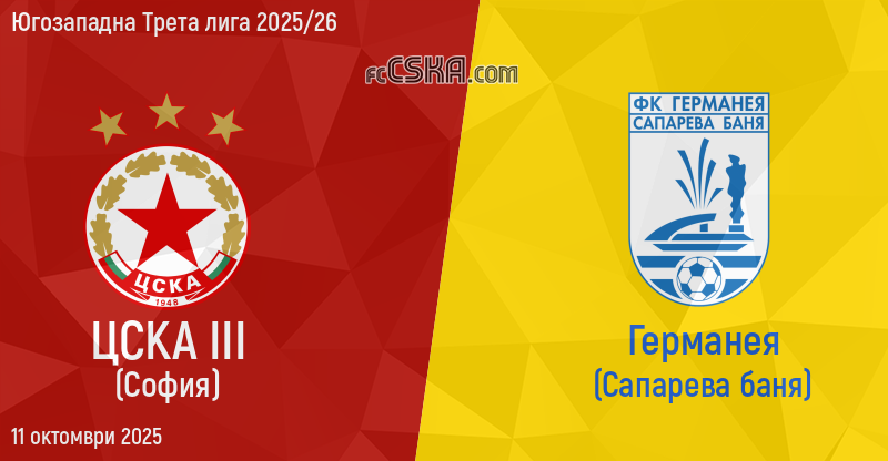 ЦСКА III ще играе с/със Германея във футболна среща от 12-и кръг на Югозападна Трета лига 2025/26 на 11 октомври 2025 г. на стадион „Бенковски“ в/във Костенец.
