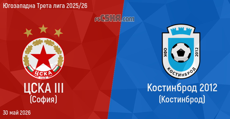 ЦСКА III​ ще играе с/със Костинброд във футболна среща от 34-ти кръг на Югозападна Трета лига 2025/26 на 30 май 2026 г. на стадион „Бенковски“ в/във Костенец. Мачът ще бъде предаван на живо по „Sportbg.bg”.