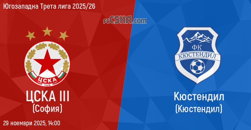 ЦСКА III ще играе с/със Кюстендил във футболна среща от 19-и кръг на Югозападна Трета лига 2025/26 на 29 ноември 2025 г. в 14:00 ч. на стадион „Бенковски“ в/във Костенец.