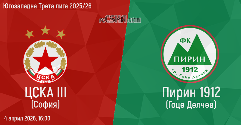 ЦСКА III ще играе с/със Пирин ГД във футболна среща от 26-и кръг на Югозападна Трета лига 2025/26 на 4 април 2026 г. в 16:00 ч. на стадион „Бенковски“ в/във Костенец.