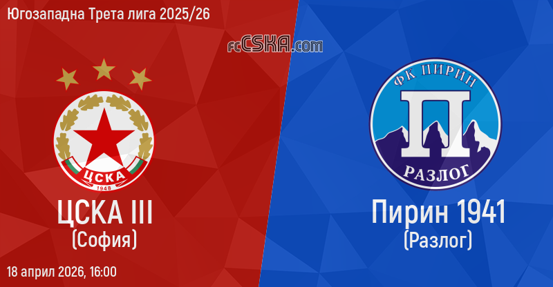 ЦСКА III ще играе с/със Пирин Рзл във футболна среща от 28-и кръг на Югозападна Трета лига 2025/26 на 18 април 2026 г. в 16:00 ч. на стадион „Бенковски“ в/във Костенец. Мачът ще бъде предаван на живо по „Sportbg.bg”.