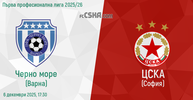 ЦСКА​ ще играе с/със Черно море във футболна среща от 19-и кръг на Първа професионална лига 2025/26 на 6 декември 2025 г. в 17:30 ч. на стадион „Тича“ в/във Варна. Мачът ще бъде предаван на живо по „Диема спорт”.