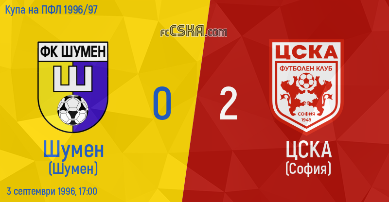 ЦСКА победи Шумен (Шумен) с резултат 0:2 във футболна среща от Първи кръг — първа среща на Купа на ПФЛ 1996/97 играна на 3 септември 1996 г. в 17:00 ч. на стадион „Панайот Волов“ в/във Шумен. Голмайстори за Армейците са Николай Николов (23′) и Иво Славчев (40′).