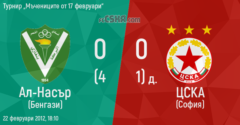 ЦСКА завърши наравно с Ал-Насър (Бенгази) с резултат 0:0 във футболна среща от Турнир „Мъчениците от 17 февруари“ играна на 22 февруари 2012 г. в 18:10 ч. на стадион „Мъчениците от февруари“ в/във Бенгази. Голмайстор за Армейците е Станко Йовчев (46′ от дузпа).