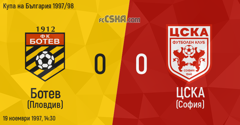 ЦСКА завърши наравно с Ботев (Пловдив) с резултат 0:0 във футболна среща от Осминафинал — първа среща на Купа на България 1997/98 играна на 19 ноември 1997 г. в 14:30 ч. на стадион „Христо Ботев“ в/във Пловдив.