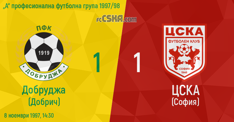 ЦСКА завърши наравно с Добруджа (Добрич) с резултат 1:1 във футболна среща от 13-и кръг на „А“ професионална футболна група 1997/98 играна на 8 ноември 1997 г. в 14:30 ч. на стадион „Луи Айер“ в/във Силистра. Голмайстор за Армейците е Методи Деянов (73′).