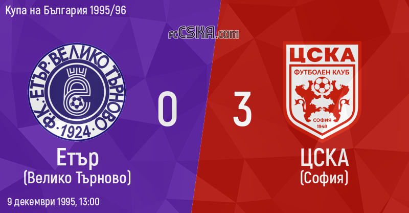 ЦСКА​ победи Етър (Велико Търново) с резултат 0:3 във футболна среща от Осминафинал — реванш на Купа на България 1995/96 играна на 9 декември 1995 г. в 13:00 ч. на стадион „Ивайло“ в/във Велико Търново. Голмайстори за Армейците са Георги К. Георгиев (47′), Петър Жабов (58′) и Ивайло Банкин (72′).