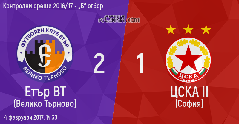 ЦСКА II загуби от Етър ВТ (Велико Търново) с резултат 2:1 във футболна среща от Контролни срещи 2016/17 - „Б“ отбор играна на 4 февруари 2017 г. в 14:30 ч. на стадион „Градски“ в/във Ловеч.